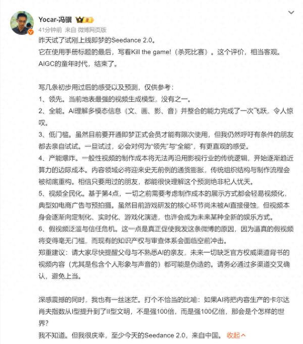 值得一提的是,近日,《黑神话·悟空》制作人、游戏科学CEO冯骥发长文谈Seedance2.0。
